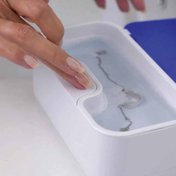 On touche souvent inconsciemment son visage pour ajuster ses lunettes, ce qui transfère des germes sur la peau. C'est pourquoi les lunettes doivent également être nettoyées de manière hygiénique. Également utilisable pour nettoyer les clés, les bijoux, etc. En seulement cinq minutes, il élimine efficacement et en douceur la saleté et la poussière grâce à des vibrations régulières. L'appareil fonctionne sans prise de courant et peut être alimenté par des piles (3 x AA, non fournies), mais il peut également être utilisé via un câble USB. Avec arrêt automatique. Dimensions : 17,5 x 9,7 x 7 cm, taille du récipient intérieur : 16,5 x 8 cm (5,5 cm dans la partie centrale) x 3,5 cm. Longueur du câble : 95 cm. Matériau : ABS, AS.
