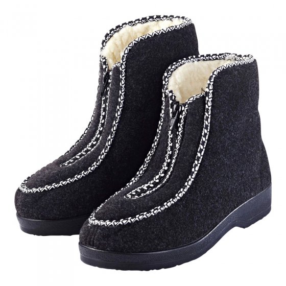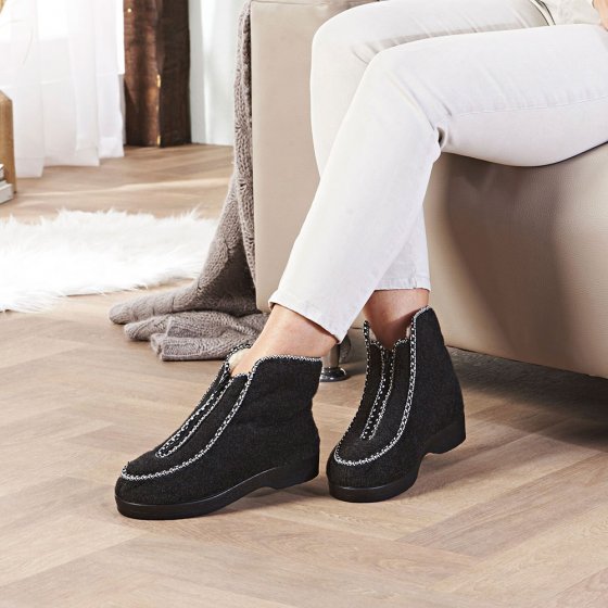 Parfaites pour les journées froides. La doublure chaude en laine vierge et la matière extérieure robuste en feutre font de ces chaussons le compagnon idéal à la maison. La semelle en caoutchouc antidérapante et la tige haute offrent un maintien et un confort supplémentaires. La fermeture éclair est particulièrement pratique, facilitant l’enfilage et le retrait, tout en permettant un ajustement individuel au pied. Doublure : 100 % laine vierge.