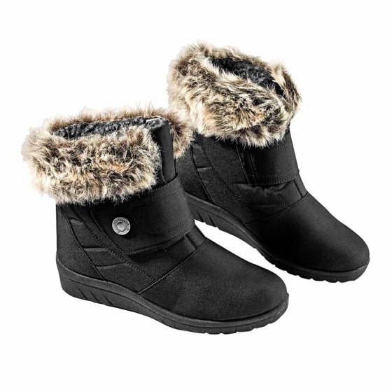 Idéal pour les journées d’hiver froides grâce à sa semelle profilée antidérapante offrant une excellente stabilité. La fermeture pratique à scratch permet un enfilage et un retrait faciles et s’ouvre très largement. La tige déperlante et la doublure chaude en fausse fourrure douce garantissent un confort maximal et une protection efficace contre le froid. Talon compensé de 4,5 cm. Tige : 100 % polyester, doublure (fausse fourrure) : 100 % polyester. Couleur : noir.