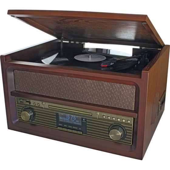 L'une des nouveautés du salon IFA déjà disponible dans notre catalogue ! La CHAÎNE HI-FI AVEC DAB+ ET FONCTION ENREGISTREMENT au look rappelant les années 50 recèle bien plus de technologie moderne que vous ne le pensez : elle numérise vos vinyles, CD et cassettes sur une clé USB, et enregistre également votre musique préférée depuis une radio numérique PLL DAB+ ou stéréo FM ! Platine vinyles (33/45/78 tours/min.) avec bras de lecture, lecteur CD programmable, lecteur de cassettes, écran LCD, télécommande et haut-parleurs stéréo (2 x 50 W) intégrés dans un boîtier mesurant env. 32 x 47 x 21 cm (L x l x h) et recouvert de bois véritable. Une superbe chaine hi-fi pour profiter des avantages d'une technologie innovante et écouter la radio au format numérique, sans interférences !