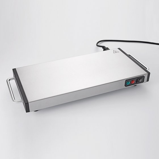 Rien n'est plus désagréable qu'un repas refroidi. C'est pourquoi le CHAUFFE-PLAT SANS FIL est indispensable à vos préparatifs de fête ! Pour un petit buffet ou un simple rôti, le chauffe-plat maintient parfaitement au chaud les aliments, accompagnements et soupes. Le noyau en céramique stocke la chaleur jusqu'à 60 minutes – pour une utilisation sans fil ! Vous pouvez aussi y chauffer les assiettes, plats et plateaux pour vos invités. Dimensions (L x l x H) : env. 48 x 20 x 6 cm. Surface de chauffe : env. 40 x 20 cm. Durée de préchauffage env. 4 minutes. Corps en acier inoxydable brossé avec pieds antidérapants en caoutchouc et poignée isolante cool touch. Alimentation secteur 230 V / 1100 W / max. 120 °C. Vous allez vous régaler !