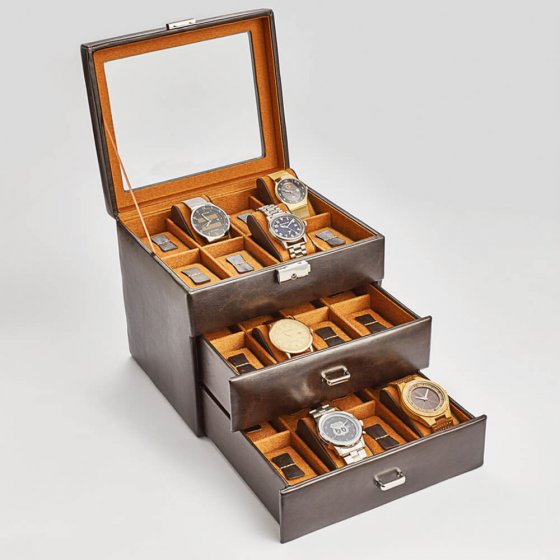 Rangement et protection de la poussière et des rayures. Disposez vos montres comme chez le bijoutier dans le COFFRET À MONTRES "EXCLUSIF". Le coffret sophistiqué permet de loger 24 montres sur 3 étages. L’étage supérieur verrouillable est muni d’un couvercle avec vitrine retenu par un ruban. Vous pouvez ainsi regarder vos montres précieuses à tout moment et elles sont quand même bien protégées. La manipulation des montres est aisée et rapide grâce aux coussins amovibles imitation daim. De plus, les coussins n’abîment pas le fond en verre et préservent la forme des bracelets en cuir. Le coffret spacieux en similicuir marron s’intègre dans tous les styles d’intérieur. Dimensions (l x H x P) : env. 22 x 20 x 19 cm. Si vous aimez vos montres, offrez-leur un rangement pratique et raffiné pour les "temps de repos".