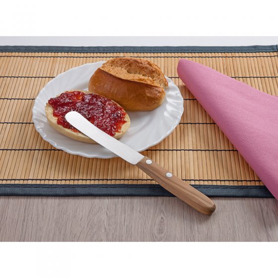 C’est un vrai plaisir dès le petit-déjeuner de constater avec quelle facilité le COUTEAU À BEURRE DE SOLINGEN coupe vos  petits pains en deux avec précision et étale finement et régulièrement le beurre dessus ! Son petit plus réside dans le tranchant fin de sa lame recourbée, fabriquée aujourd'hui dans la coutellerie de Solingen, exactement comme il y a plus d'un siècle : avec le plus grand soin et à la main. Sa lame acier inoxydable au chrome, molybdène et vanadium atteint ainsi une perfection qu'il est quasiment impossible d'obtenir avec une machine. Le résultat : des couteaux extrêmement aiguisés et durables de qualité Solingen, parfaits pour le petit-déjeuner, le repas du soir et bien plus encore. Aussi bien maîtrisé que la lame, son manche en bois d'olivier récolté à la main. Car l'olivier est un arbre qui pousse lentement, ce qui fait de son bois l'un des plus durs et des plus denses au monde. Il n'absorbe quasiment aucune odeur et sa forte teneur en huile agit comme un agent antibactérien, ce qui le rend idéal à long terme en cuisine et à table. Livré dans un coffret cadeau décoratif. Longueur totale : 21,9 cm, longueur de la lame : 11,5 cm, poids : 37 g. Une idée de cadeau à double tranchant : à offrir ou pour vous-même !