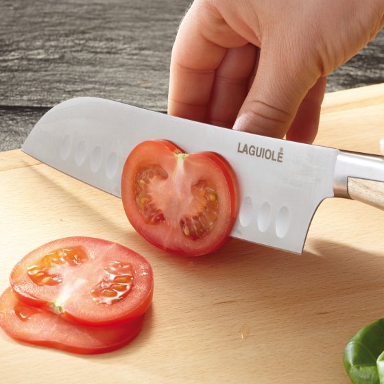 Normalement, les couteaux Laguiole se trouvent dans les poches de pantalon – par contre, ce COUTEAU SANTOKU LAGUIOLE ultra-tranchant rend de grands services à la cuisine ! Sa lame alvéolée de 17 cm de long est parfaite pour préparer viande, poisson et légumes. Rien n'adhère à la lame en inox, même quand vous coupez de très fines tranches ! La soie atypique se prolonge sur toute la longueur du manche en bois de frêne et fait de ce couteau un véritable accroche-regard en même temps qu'un outil parfaitement équilibré. Dimensions (L x l x H) : env. 30 x 2 x 5 cm. Poids : env. 185 g. Un cadeau parfait quand vous êtes invité à manger chez des amis !