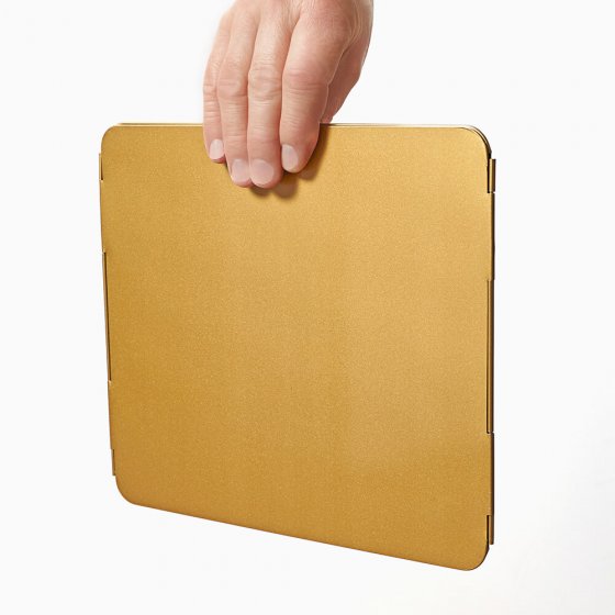 Depuis des décennies, les cuisiniers amateurs et femmes au foyer apprécient les avantages de l'ÉCRAN PLIANT ANTI-PROJECTION pour cuisinière ou barbecue. Non sans raison, car le dispositif en métal articulé par charnières économise bien du travail de nettoyage quand on a fini de cuisiner ! Dressé entre la poêle et le mur de la cuisine, il empêche les projections de graisse et de sauce sur la cuisinière et le mur de la manière la plus simple qui soit. Grâce à son revêtement antiadhésif, le nettoyage ultérieur se fait sans effort ; bien entendu, l'écran va aussi au lave-vaisselle. Matière : acier de qualité supérieure avec revêtement couleur de cuivre. Dimensions (l x H, déplié) : 75 x 23 cm. Également idéal pour les barbecues à gaz avec brûleur latéral pour faire écran au récipient de cuisson.