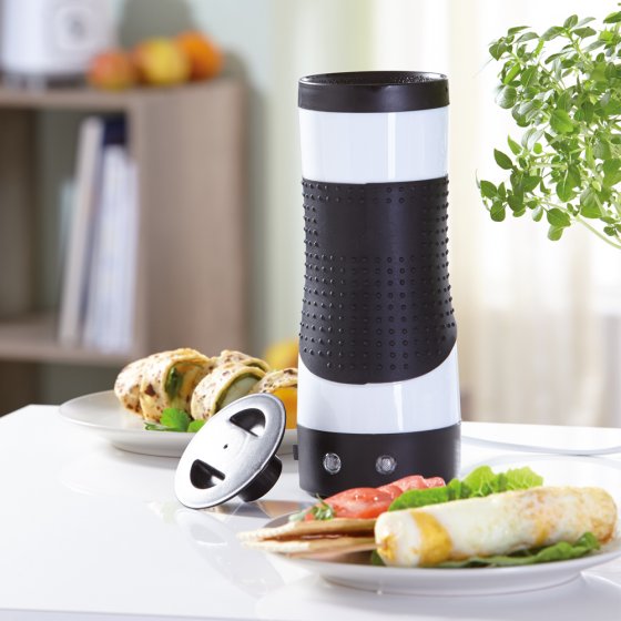 Cuits, pochés, frits ou en gelée, les oeufs se préparent de mille façons différentes. Que diriezvous d'ajouter un peu d'originalité dans tout cela en utilisant un CUISEUR À OEUF VERTICAL ? Il cuit vos aliments en leur donnant une forme cylindrique pour que vous puissiez ensuite les déguster sur le bâton comme une barbe à papa ! La préparation pour obtenir ces oeufs sur bâton est incroyablement simple : il suffit de battre les oeufs directement au-dessus du cuiseur en marche, puis de les verser dans le cuiseur (sans les coquilles), de patienter 6 à 8 minutes et c'est tout. Grâce à son intérieur anti-adhésif, les aliments n'attachent pas. Préparez pizzas, tortillas ou tartines grillées en forme de cylindre : laissez libre cours à votre imagination culinaire ! Livrés avec le cuiseur : une brosse de nettoyage, un poussoir et 5 bâtonnets en bois. Fonctionne sur secteur (230 V). Longueur env. 23,5 cm. Diamètre env. 9,5 cm. Dégustez des oeufs de Pâques très différents et originaux !