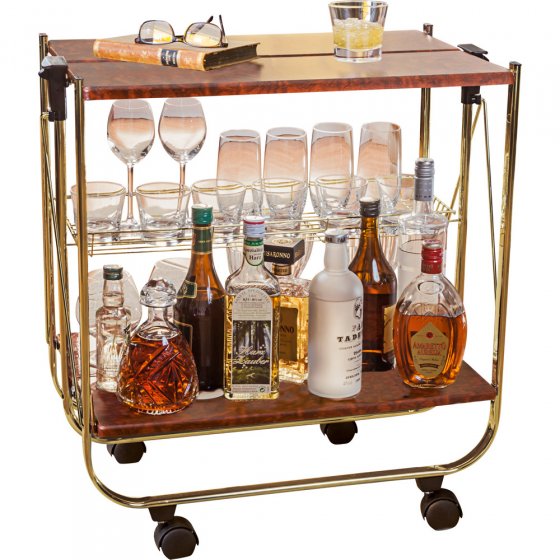 brillant aspect laiton et son plateau rabattable en MDF solide et de grande qualité aspect „bois de racine“, elle