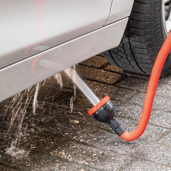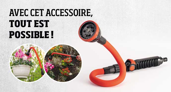Cet embout flexible vous permet d’arroser vos plantes et vos plates-bandes encore plus facilement. Le tuyau flexible de 60 cm de long est d’une part très pratique pour les plantes qu’on doit arroser à leur racine et non pas en hauteur ; d’autre part, vous pouvez le poser à l’endroit souhaité dans le jardin et laisser l’EMBOUT FLEXIBLE POUR TUYAU D'ARROSAGE s’occuper tout seul du travail. Vous pouvez donner au tuyau la forme que vous souhaitez. D’une seule main, c’est également très facile de régler le débit de l’eau en continu et de choisir entre les 10 jets différents. Longueur totale : env. 75 cm. Tuyau à revêtement intérieur en inox pour une pression maximale de 6 bars. Un accessoire incontournable aux multiples talents pour tous les travaux d’arrosage dans votre jardin !