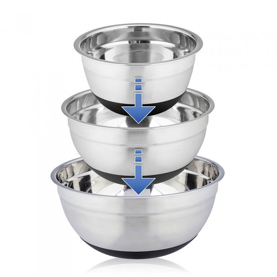 Saladiers en inox de qualité supérieure pour préparer et servir. Base antidérapante en silicone pour une bonne stabilité. L'ENSEMBLE DE SALADIERS ANTIDÉRAPANTS EN INOX consiste en 3 saladiers emboîtables (Ø 14, 20, 26 cm) avec une capacité respective de 600 ml, 1.700 ml et 4.000 ml. Faits de matériaux haut de gamme, ils font très bel effet pour un buffet ou sur la table. Hygiéniques et durables. Vont au lave-vaisselle. Ces saladiers ne devraient manquer dans aucune cuisine !