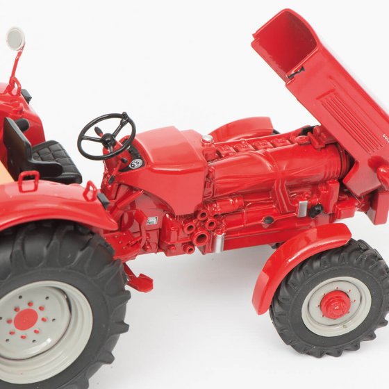 Le Güldner G75, fleuron du fabricant de tracteurs Güldner basé à Aschaffenbourg, fut disponible à partir de 1965 en version tout terrain. Le Güldner G-75 A – le "A" signifiant Allrad, c'est-à-dire "toutes roues motrices" – avait 5 CV de plus que son frère à traction arrière, le G-75. Équipé d'un grand moteur diesel de 4,7 litres, 6 cylindres en ligne et puissant de 75 CV, le G-75 fut construit à exactement 201 exemplaires entre 1965 et 1969. Le modèle de collection à l'échelle 1:32 du GÜLDNER G75 A AVEC ROULOTTE DE FORAIN, tel qu'on pouvait le voir sur les routes des années 50 et 60, est strictement limité à 500 exemplaires.