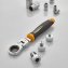 Plus besoin de chercher : grâce à sa conception ingénieuse, le JEU DE CLÉS À CLIQUET AJUSTABLES remplace 3 clés de taille différente – ce qui fait gagner de la place et du temps. Les 3 entraînements (1/4“, 3/8“, 1,2“) se changent rapidement sur pression d'un bouton. Grâce à la tête articulée inclinable sur 180° et la transmission à 72 dents avec un angle de levier de 5° seulement, il est encore plus facile de travailler dans les coins et les espaces étroits. La rotation droite/gauche permet une utilisation flexible. Dimensions (L x l x H) : env. 19 x 3,5 x 2 cm. Matière : acier chrome vanadium. Poignée antidérapante à 2 composants – saisissez-la et au travail !