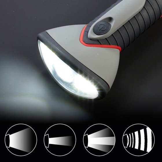 Quelles fonctions devrait avoir à votre avis la lampe de poche idéale pour une utilisation quotidienne ? Elle doit être capable, d'une part, d'envoyer son faisceau lumineux sur une longue distance – et d'autre part, d'éclairer l'environnement immédiat pour vous permettre de voir à tout moment ce qui se passe autour de vous. La LAMPE DE POCHE GRAND ANGLE répond à ces exigences : une LED de focalisation génère un faisceau lumineux concentré à grande portée, et les 24 LED surround servent à éclairer l'entourage immédiat. (Les deux fonctions d'éclairage peuvent être activées aussi bien séparément qu'ensemble.) De plus, la lampe offre une très bonne prise en main grâce à sa surface rainurée soft touch. Dimensions (L x l x P) : env. 20 x 9 x 5 cm. Fonctionne avec 3 piles AA (vendues séparément). Avec cette lampe, même dans l'obscurité, vous avez toujours l'essentiel sous les yeux !