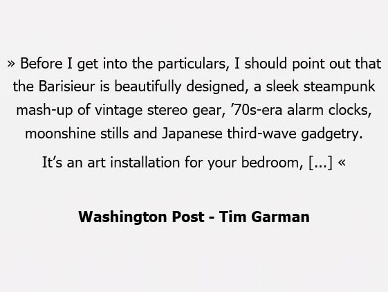 Savourez votre première tasse de café au lit – ce luxe est possible avec LE BARISIEUR. Cette machine à café de designer avec réveil intégré permet de préparer du café finement moulu avec l’alarme ou manuellement. La qualité des finitions et des éléments en verre, inox et bois ne manquera pas d’impressionner tous les amateurs. Le compartiment réfrigéré garde le lait au frais toute la nuit. Le tiroir hermétique sert à ranger le café, le thé ou le sucre selon votre goût. Tous les éléments sont modulables et vont au lave-vaisselle. La machine peut aussi servir à la préparation élégante d'une tisane calmante pour la nuit. Des experts renommés sont déjà convaincus par la saveur exceptionnelle du café et du thé préparés avec cette machine. Tout y est, y compris un connecteur USB pour charger vos appareils. Alimentation secteur 230 V. Puissance 500 W. Dimensions (l x H x P) : env. 25 x 8 x 17 cm. Offrez-vous un peu de luxe !