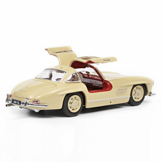 La MERCEDES-BENZ 300 SL – également appelée "papillon" – est la voiture de sport allemande dont tout le monde rêvait à l’époque du miracle économique. Conçue en 1954, elle était à l’origine exclusivement destinée aux courses automobiles sur les circuits du Mans ou de Targa Florio. La variante routière W 198 s’imposa très vite comme voiture de rêve des passionnés d’automobile. Avec ses 215 CV et sa cylindrée de 2996 cm3, c’était la voiture de série la plus rapide de l’époque avec une vitesse de pointe de 250 km/h. Elle est aujourd’hui disponible en tant que modèle 1:43 en fonte de zinc injectée avec portières ouvrables et roues mobiles, en édition limitée à 750 exemplaires. Dimensions (L x l x H) env. 10 x 4 x 3 cm. À propos, la mention supplémentaire "SL" est l’abréviation de "super leicht" – super léger.