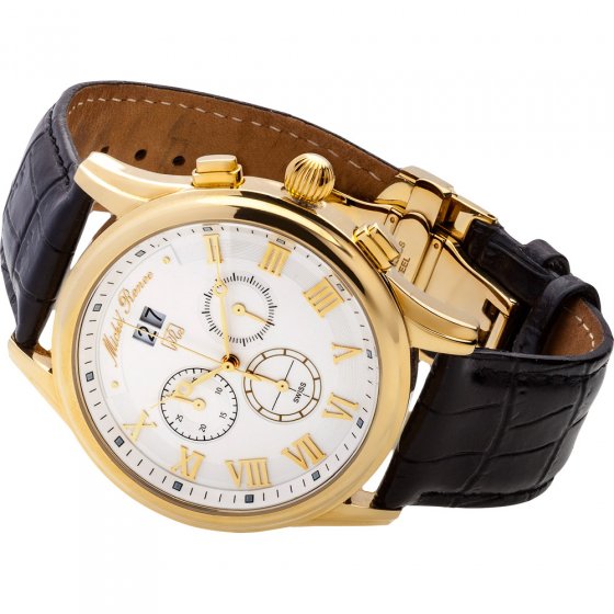 Vous avez un faible pour les sports automobiles classiques ? Vous participez peut-être à des rallyes ou à d’autres activités de loisirs pour lesquelles il est important de mesurer le temps précisément ? Alors cette MONTRE HOMME "GOLDEN CHRONO" est pour vous : contrairement à la plupart des montres chronos à cadran analogique, elle offre une précision au dixième de seconde et non à la seconde près ! Vous pouvez également définir des temps intermédiaires, ce qui n’est pas toujours le cas sur les montres chronos standard, même de grande qualité. L’indication de la date par deux disque au niveau du 12 du cadran souligne la haute technicité de cette montre. Malgré son côté sportif, la "Golden Chrono" sera également parfaite pour une soirée élégante car l’association du cadran blanc scintillant et recouvert d’une couche argentée spéciale et de son boîtier couleur or est aussi classique qu’élégante. Diamètre du boîtier : env. 44 mm. Épaisseur du boîtier env. 9 mm. Cette montre "Golden Chrono" est livrée dans une boîte cadeau. Vous voulez vous offrir quelque chose ? Offrez-vous donc cet "âge d’or" !