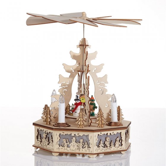 Les pyramides de Noël dont les ailes tournent à la chaleur des bougies sont une décoration traditionelle fort appréciée. Mais que faire quand vous devez quitter la pièce ? Avec cette PYRAMIDE ELECTRIQUE vous ne courrez plus aucun risque : les bougies sont éclairées par des LED pour que vous puissiez vaquer à vos occupations en toute quiétude. Autre avantage de la technologie LED : rien ne goutte, la cire chaude ne coule pas sur vos meubles. Pour faire tourner la pyramide, un moteur est intégré à la structure. Fonctionne sur 230 V (bougies et moteur), câble fourni. Matériau : bois. Dimensions : Ø env. 17 cm, Hauteur env. 32 cm. Cette pyramide vous réjouira de longues années durant – en toute sécurité !