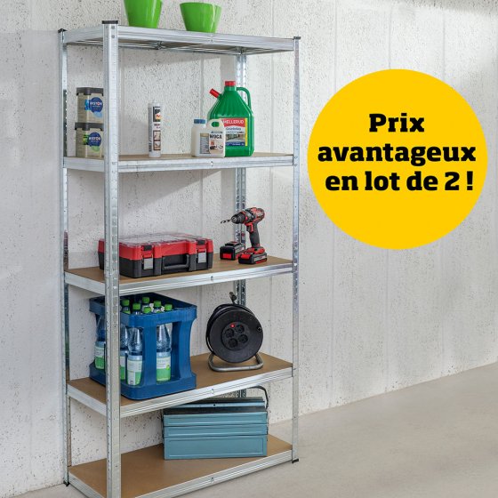 Modulable, robuste, avec une capacité de charge énorme – voici le RAYONNAGE POUR CHARGES LOURDES 875 KG. Utilisez-le comme étagère murale à hauteur d'homme, comme buffet ouvert (pour ranger les caisses de boissons ou les cartons de lessive) ou comme table d'atelier à grande stabilité ! Chacune des 5 étagères peut être fixée à la hauteur voulue pour faire de la place pour ce qu'on a prévu d'y ranger. Chaque étagère supporte une charge de 175 kg répartie de manière homogène – ce qui correspond à une dizaine de caisses de bouteilles remplies d'eau. Matière : structure en acier galvanisé et MDF (étagères). Dimensions (étagère murale, H x l x P) : env. 180 x 90 x 40 cm. Faites de la place et de l'ordre dans le garage, la cave, le cellier ou la cabane de jardin !