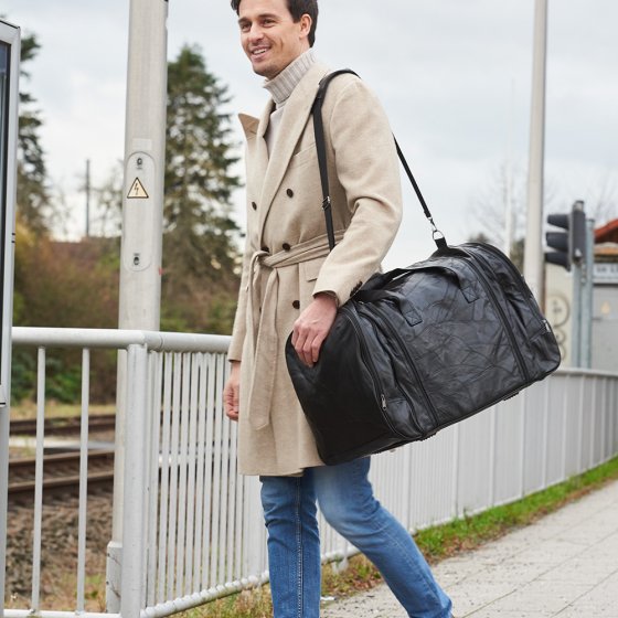 Vous cherchez depuis longtemps un sac de voyage où il serait possible de caser des chemises et des pantalons pliés sans risque de les froisser ? Le voici : le SAC DE VOYAGE EN CUIR À OUVERTURE LATÉRALE s'ouvre très largement (sur env. 34 x 34 cm) – vous permettant ainsi de mettre les vêtements bien à plat ! De forme stable et moderne, ce sac est un bagage idéal pour les weekends. Avec une grande poche extérieure zippée de chaque côté et une poche zippée sur le rabat intérieur, il permet de ranger de manière ordonnée les petits appareils électroniques, produits de beauté et autres objets importants. Poignées de transport et bandoulière. Dimensions (l x H x P) : env. 60 x 38 x 32 cm. Bon voyage !