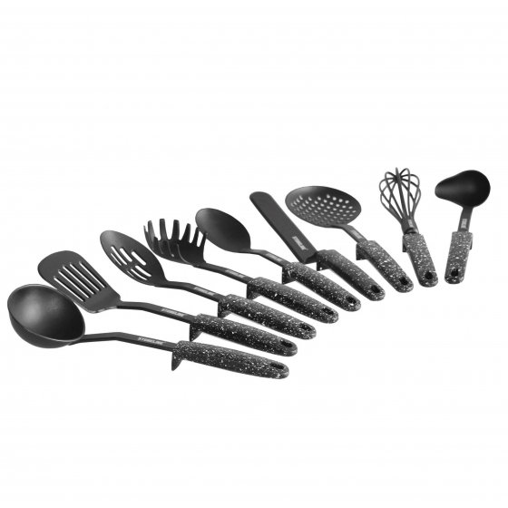 Set de 9 ustensiles pour toutes les utilisations : louche, écumoire, cuillère de service, cuillère de service à rainures, cuillère à spaghettis, fouet, spatule, cuillère à sauces, cuillère à bec verseur