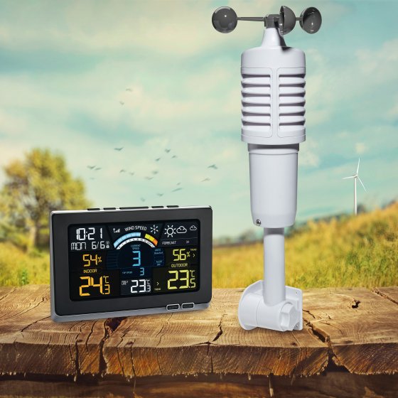 Depuis quelque temps, les tempêtes font de plus en plus de dégâts. Et le vent a une influence décisive sur la température ressentie, et par conséquent sur notre sensibilité au froid. Heureusement qu’il est possible de surveiller les conditions météo chez soi, en tout confort et à l’abri grâce à l’ultra-moderne STATION MÉTÉO RADIO-PILOTÉE AVEC ANÉMOMÈTRE. Installez simplement l’anémomètre robuste à capteurs intégrés à l'extérieur. L’appareil communique sans fil, par ondes radio, la température extérieure, l’humidité atmosphérique et la force du vent avec représentation graphique de la vitesse. L’écran en couleur à fort contraste se règle sur deux niveaux de luminosité. Il indique également l’heure et la date. Dimensions de la station (l x H x P) : env. 21 x 14 x 3 cm. Soyez toujours parfaitement informé sur le temps qu’il fait !