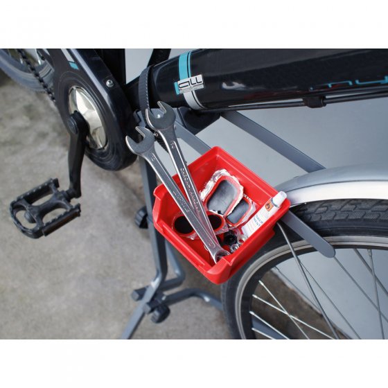 Un vélo a besoin d’entretien et parfois de réparations au même titre qu’une voiture. Pour votre voiture, pas de souci : un pont élévateur ou une fosse de réparation et le tour est joué... mais quelle solution pour votre vélo ? Notre SUPPORT DE MONTAGE POUR VÉLO ! Ce support en acier à trois pieds parfaitement stables et qui s’adapte à tous les modèles de vélos, vous permet de bricoler à votre chaîne ou à votre pédalier sans vous casser le dos. Il se monte en un tour de main et se règle sur trois hauteurs de travail selon vos besoins. Le pédalier et la roue avant du vélo étant fixés, votre vélo est parfaitement maintenu sur le support. Un compartiment de rangement en plastique sur le pied vous permet d’avoir vos outils et petites pièces (vis, écrous, valves etc.) à portée de main. Après utilisation, ce support se démonte et se range sans prendre de place dans la cave ou le garage. Force portante max. : 30 kg. Poids env. 3,5 kg. Hauteur maximale (monté) : 110 cm. Facile à monter. Pour celui qui entretient son vélo lui-même, ce support de montage deviendra très vite indispensable !