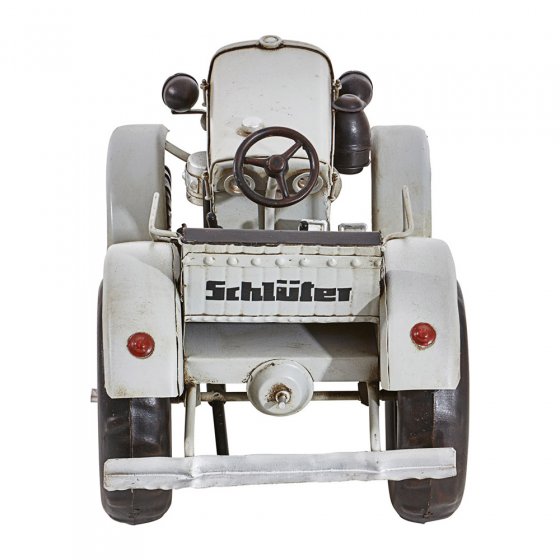 Les tracteurs Schlüter ont marqué l'histoire de l'agriculture pendant les années trente. Le DS 15 de 15 chevaux, construit à partir de 1950, est arrivé à point juste après la guerre, car de nombreuses fermes avaient alors besoin d'un petit tracteur universel économique à petit moteur. Cette miniature du TRACTEUR "SCHLÜTER" EN TÔLE DS 15, entièrement fabriquée et peinte à la main, séduit par son allure rustique renforcée par des traces d'oxydation visibles. Ses roues sont entièrement en tôle, tout comme le corps. Les roues et le volant tournent. Dimensions (L x l x H) : env. 28 x 15 x 15 cm. Qui pourrait résister au charme de ce chef d'œuvre métallique autonome ? Certainement pas un véritable collectionneur !