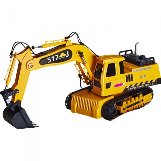 comme son grand frère mais ce n’est pas tout : son bras articulé et sa pelle bougent comme des vrais ! La tourelle pivote à 360 degrés. Sa direction fonctionne de la même manière que celle d’un véhicule à chenilles, à savoir par l’actionnement précis de la chenille gauche ou de la chenille droite. Toutes les opérations s’accompagnent d’un bruit de moteur (désactivable). La fonction de programmation permet de programmer toutes les étapes des travaux pour transformer le tractopelle en robot. Portée de la télécommande : env. 50 m. Dim. env. 45 x 15 x 26 cm. Fonctionne avec 5 piles AA (vendues séparément). Réalisez votre rêve d’enfant : qui n’a pas rêvé un jour de conduire un tractopelle ?