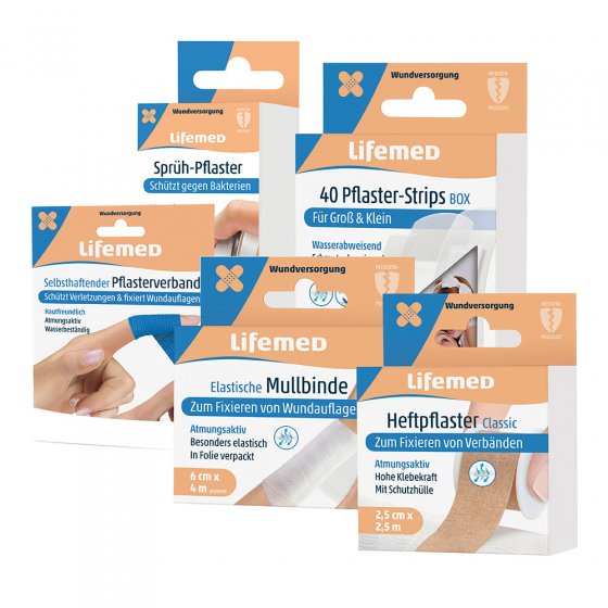 La plupart des accidents se produisent à la maison – et il faut réagir vite pour soigner les blessures ! La trousse de premiers secours pour l'armoire à pharmacie contient tout ce qu'il faut pour soigner tout de suite chez soi les petites plaies, coupures ou éraflures. Contenu : pansement liquide en spray, boîte de 40 pansements, bande de gaze, sparadrap (pour fixer les bandages) et rouleau de bandage auto-adhésif.
